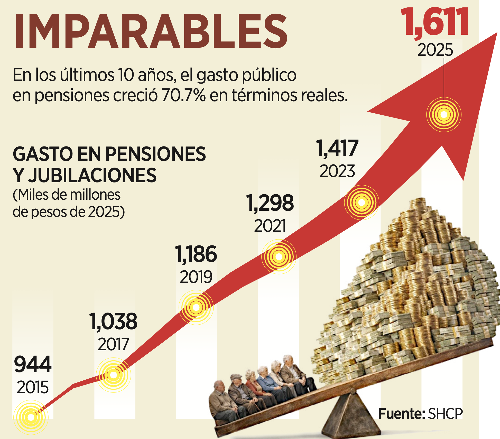 En 2025, el gasto en pensiones y jubilaciones del Gobierno federal rebasó los 1.6 billones de pesos, lo que significó un incremento de 6.8 por ciento real anual, exhiben datos de la Secretaría de Hacienda (SHCP).