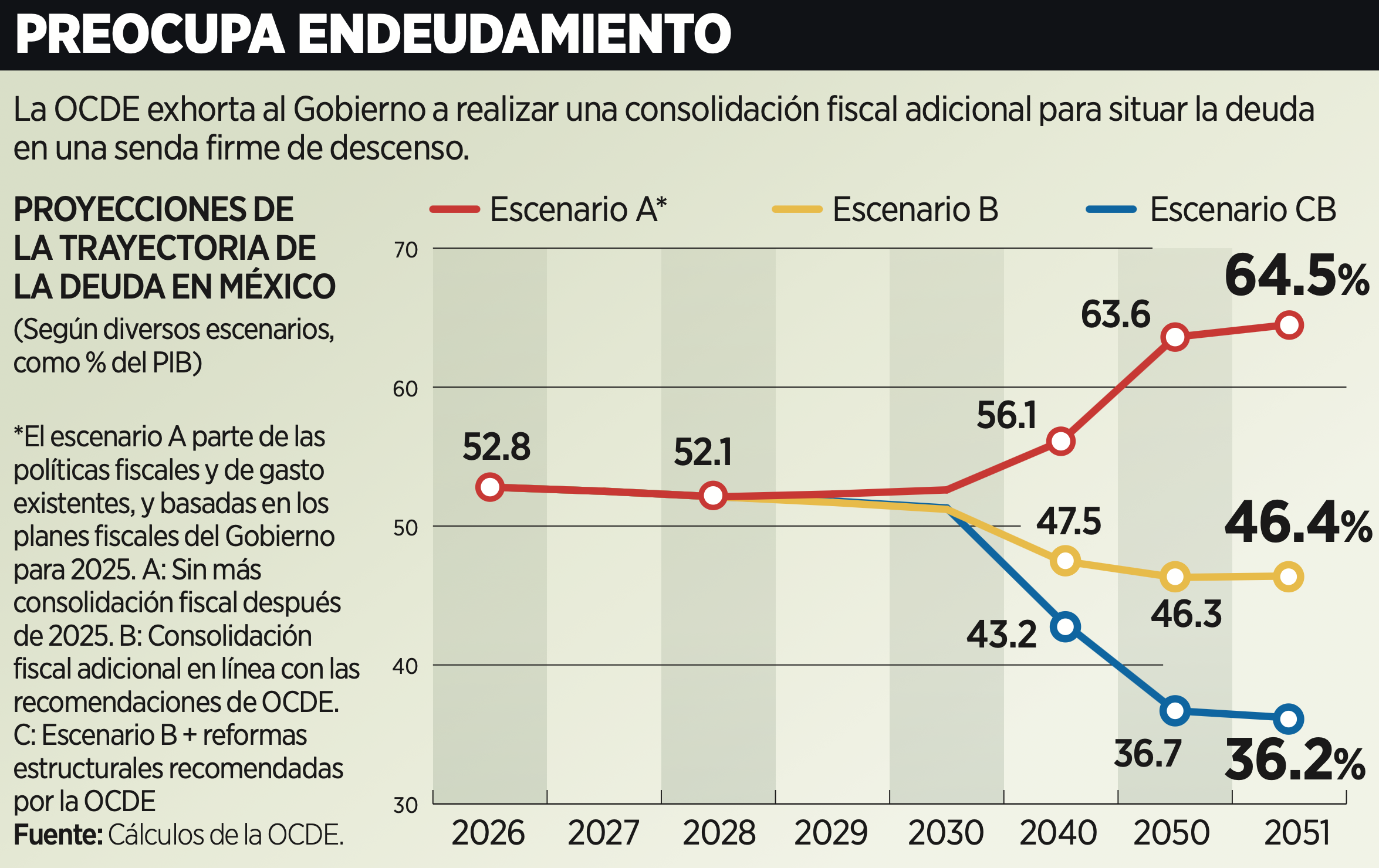 En tanto, el escenario C, que considera la suma de una mayor consolidación fiscal con la implementación de reformas estructurales recomendadas por la OCDE, lleva la deuda hasta 36.2 por ciento para 2051.