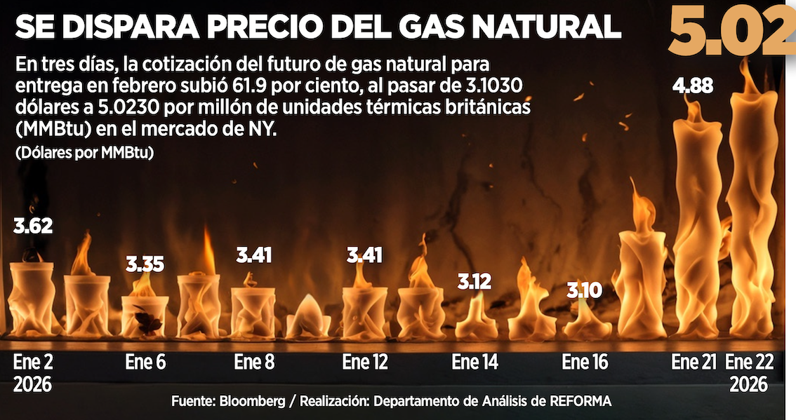 Los futuros del gas natural subieron en tres días 75 por ciento hasta 5.57 dólares la Unidad Térmica Británica (BTU, por sus siglas en inglés) para entregas de febrero.
