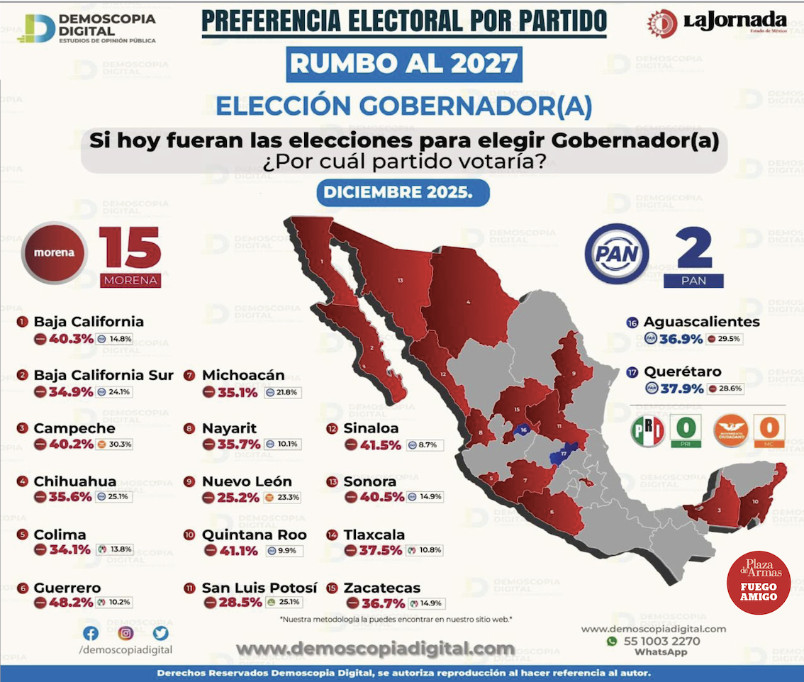 AL CIERRE DE 2025 Morena aventaja en 15 de los 17 estados que elegirán gobernadores dentro de año y medio. Los únicos que podría mantener el Partido Acción Nacional son Querétaro y Aguascalientes, de acuerdo con la última encuesta del año realizada y publicada por Demoscopía Digital y La Jornada. Según el estudio, la 4T le arrebataría Jalisco y Nuevo León a Movimiento Ciudadano y  Chihuahua al PAN.