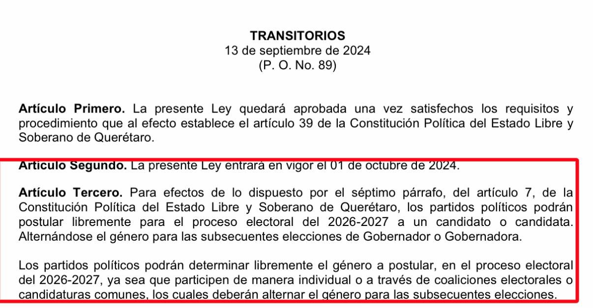 La alternancia de género aplicará hasta el 2033 conforme a la Constitución del Estado aún si se aprobara la iniciativa de ley (con aroma de mujer) enviada por el IEEQ al Congreso local, cuyo artículo 161 bis manda postular género distinto al de la elección anterior. Dicho de otro modo. El PAN no está obligado a llevar candidata a la gubernatura en el 2027.