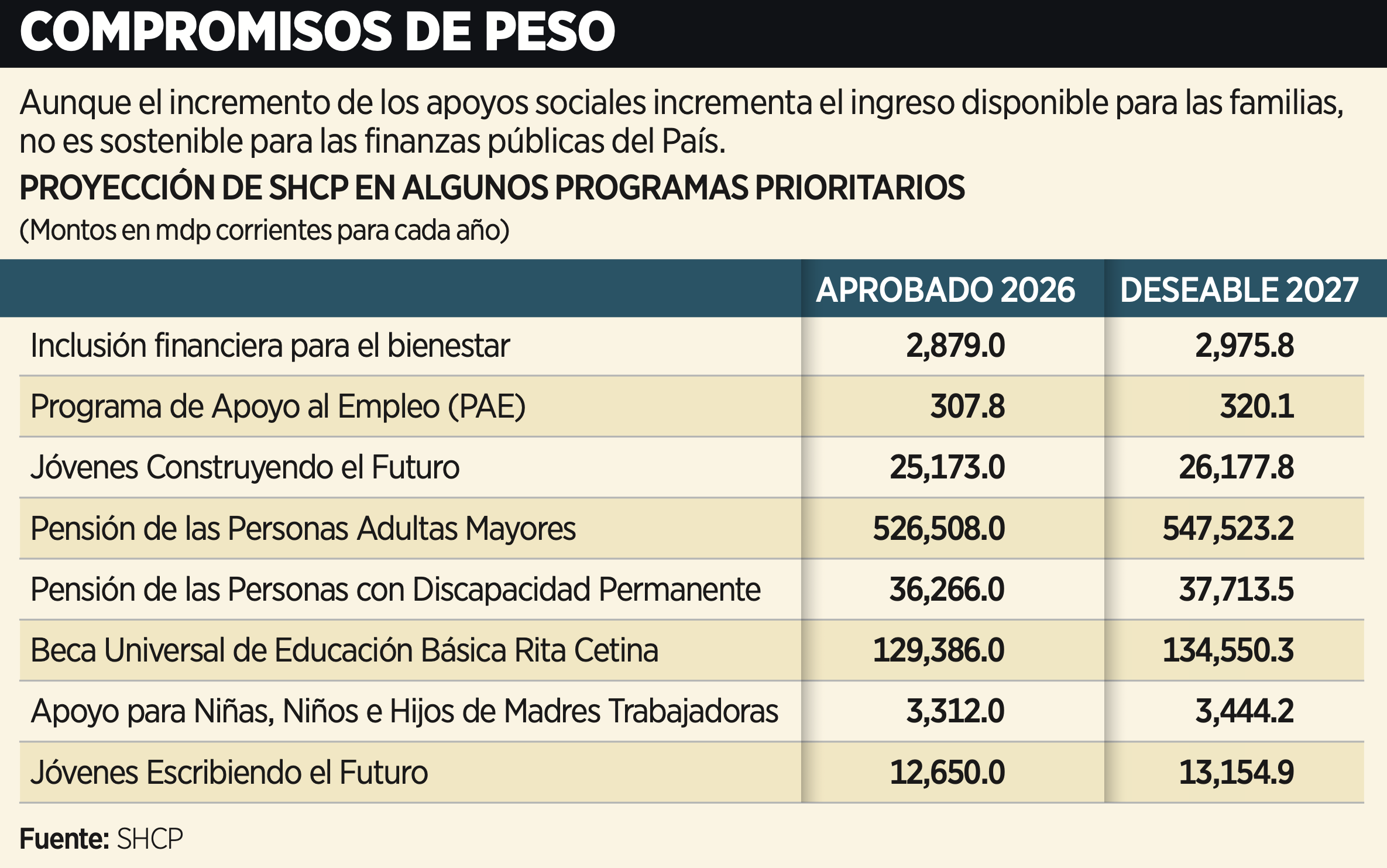 La mayor carga de los apoyos sociales dificultará el cumplimiento de las metas de crecimiento y consolidación fiscal previstas para 2026 y 2027, advirtieron expertos.