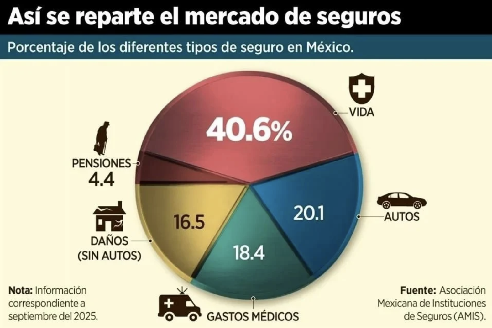 De acuerdo con la Asociación Mexicana de Instituciones de Seguros (AMIS), el 40.6 por ciento del pago de primas de seguros se concentran en los de vida, seguido de un 20.1 por ciento de autos.