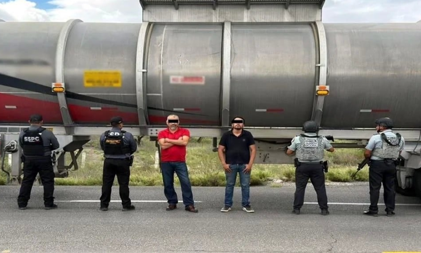 En San Luis Potosí, en la carretera Tula-San Antonio, agentes de la Secretaría de Seguridad y Protección Ciudadana (SSPC) detuvieron a dos personas a bordo de un tractocamión acoplado a un autotanque que transportaba 55 mil litros de hidrocarburo, sin acreditar su legal procedencia.