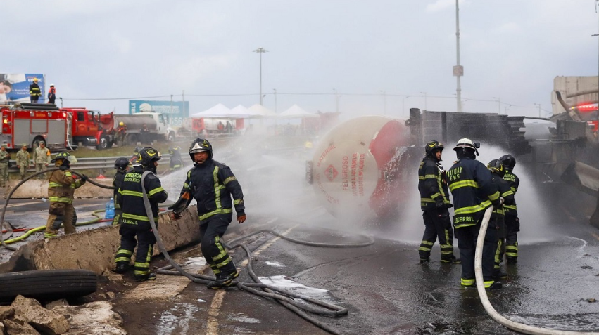 Primeros informes refieren que una pipa de gas LP volcó debajo del Puente de la Concordia, lo que originó una fuga y una explosión, cuya onda expansiva dañó 32 vehículos.