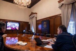 Además, al encuentro virtual con mandatarios y mandatarias de Veracruz, Puebla, Hidalgo, San Luis Potosí, Querétaro y Guerrero, asistieron los titulares de las Secretarías de Defensa, Marina, Comunicaciones y Transportes, Gobernación y Bienestar.