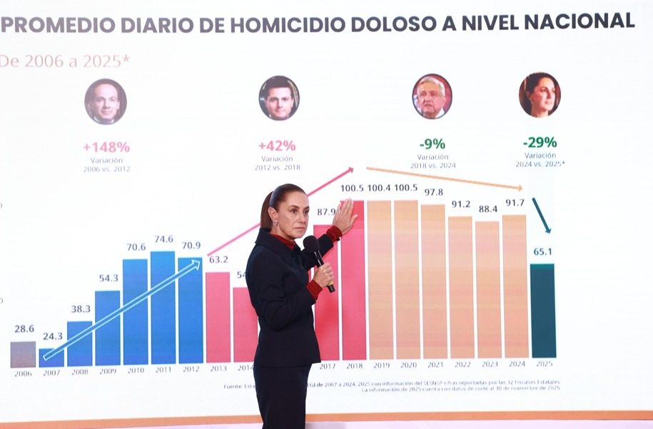 En lo que va del actual Gobierno, la lámina muestra un descenso pronunciado, al pasar de 91.7 homicidios diarios en 2024 a 65.1 en 2025, lo que implica una reducción de 29 por ciento, con datos preliminares con corte al 30 de noviembre de 2025.