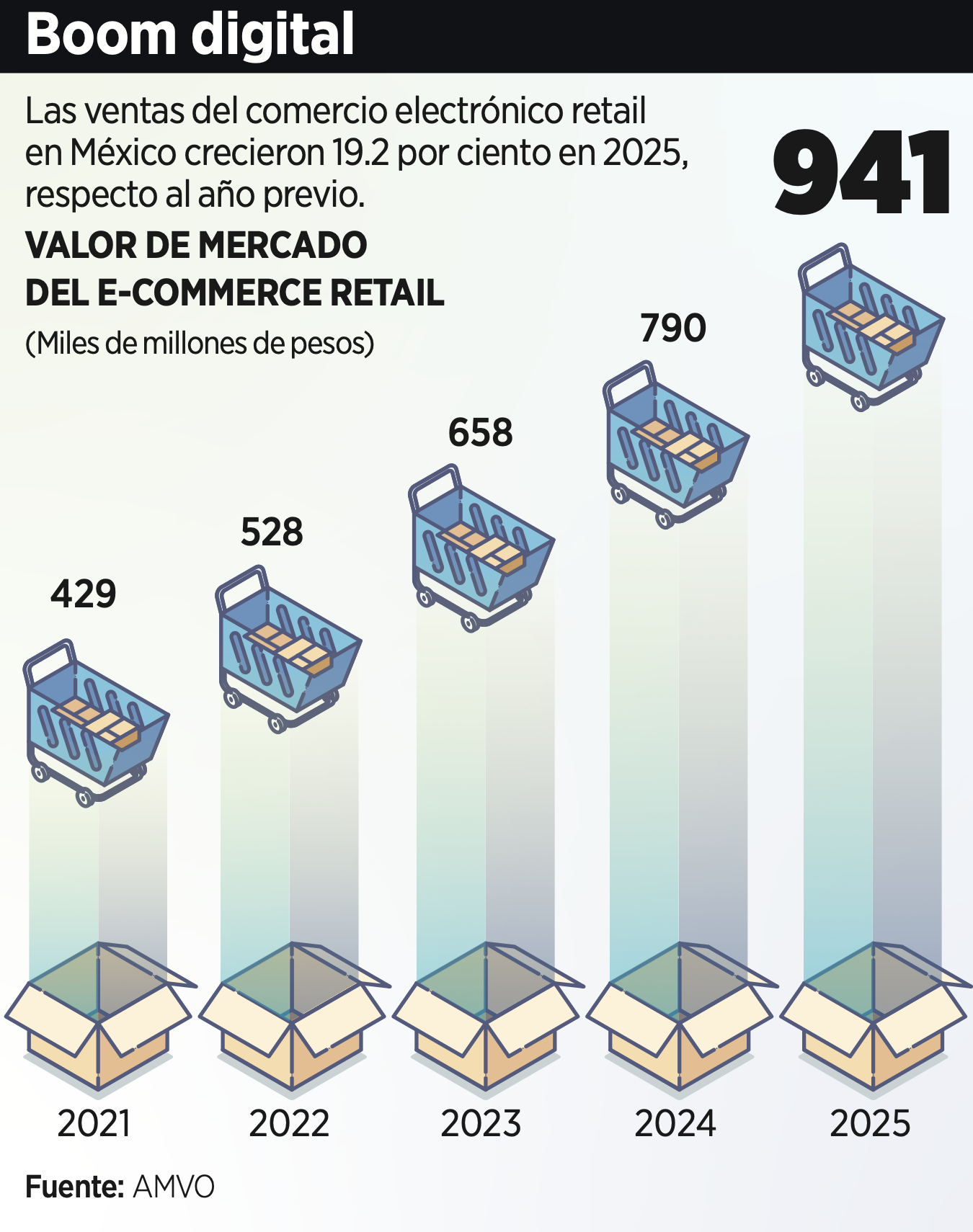 El comercio electrónico en México registró un crecimiento anual de 19.2 por ciento en 2025, para alcanzar un valor de mercado de 941 mil millones de pesos, de acuerdo con el “Estudio de Venta Online 2026”, elaborado por la Asociación Mexicana de Venta Online (AMVO).