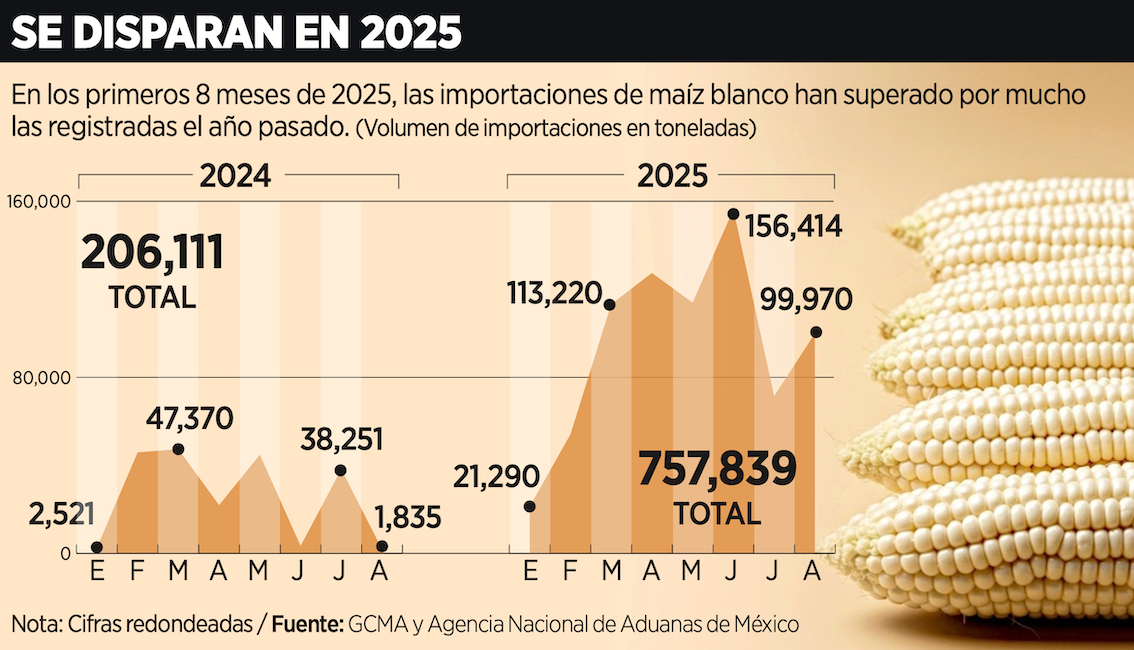 De acuerdo con datos de Grupo Consultor de Mercados Agrícolas (GCMA), en los primeros 8 meses del año, México importó 760 mil toneladas de maíz blanco, empleado para consumo humano, lejos de las 210 mil toneladas que se adquirieron en el mismo periodo de 2024, es decir, un aumento anual de 268 por ciento por volumen.