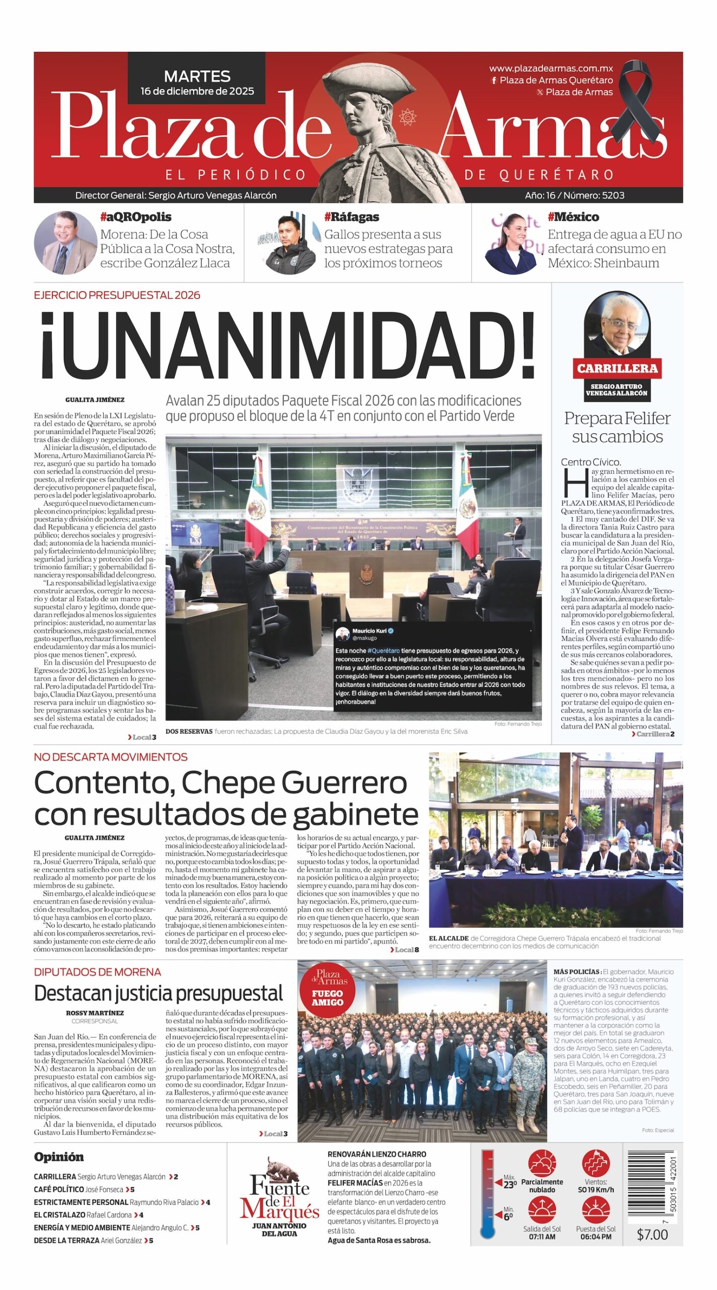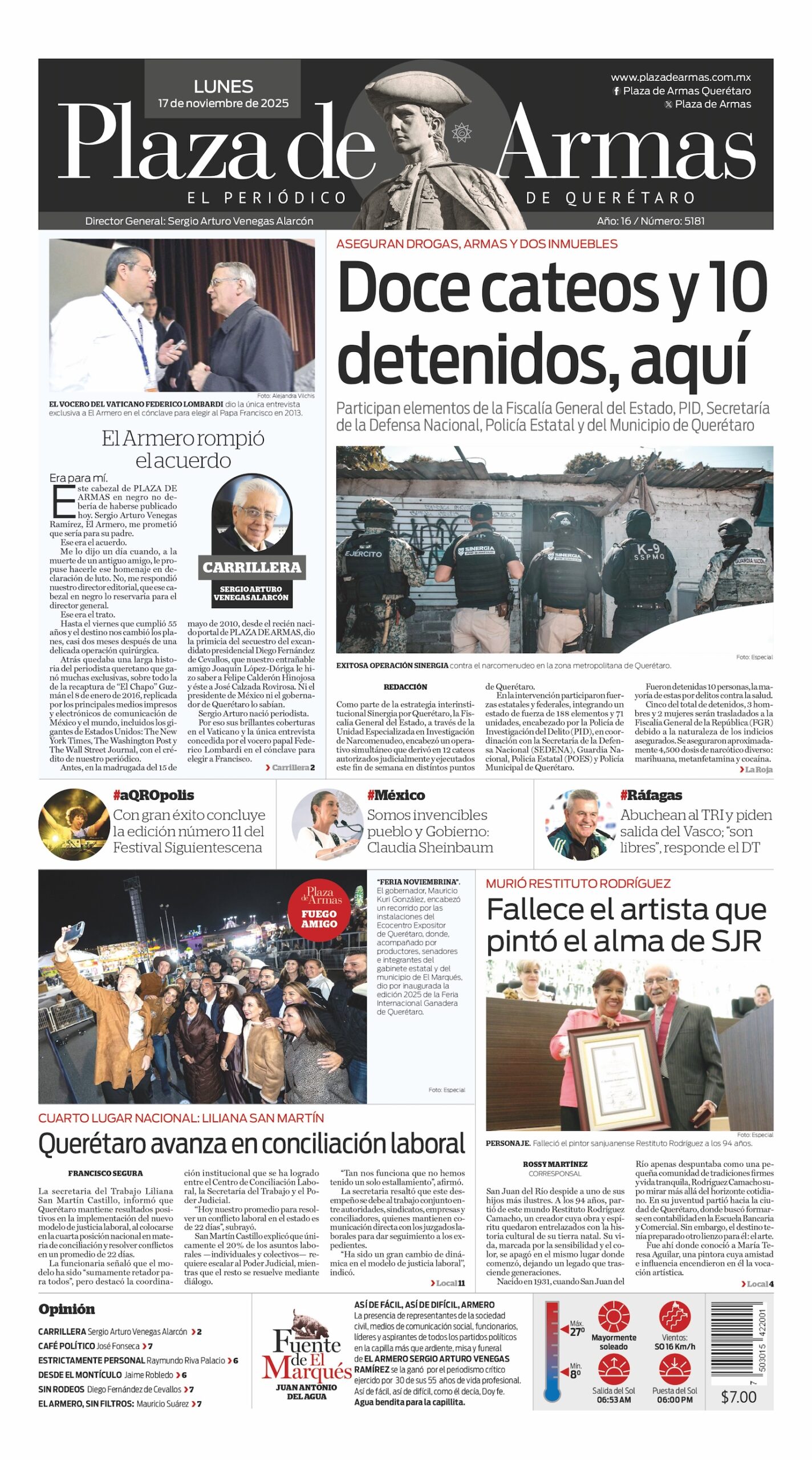 14 Murió luego de una delicada operación quirúrgica el periodista Sergio Arturo Venegas Ramírez, El Armero, fundador y director de Plaza de Armas, ganador de exclusivas como la de la recaptura de “El Chapo” Guzmán el 8 de enero de 2016, replicada por los principales medios impresos y electrónicos de comunicación de México y el mundo, incluidos los gigantes de Estados Unidos: The New York Times, The Washington Post y The Wall Street Journal, con el crédito de nuestro periódico. Dio hace 16 años la noticia del secuestro del excandidato presidencial Diego Fernández de Cevallos y cubrió tres cónclaves para la elección de los Papas Benedicto XVI, Francisco y León XIV. Colaboró en numerosos espacios radiofónicos, fundó el diario Milenio de Veracruz en Xalapa y fue coordinador de información del Grupo Imagen a nivel nacional. Su fallecimiento fue comentado por importantes comunicadores, entre ellos Joaquín López-Dóriga, Raymundo Riva Palacio y Jorge Fernández Menéndez, así como en medios impresos y electrónicos locales, mereciendo un minuto de aplausos de los compañeros del gremio. Plaza de Armas publicó su cabezal en negro.