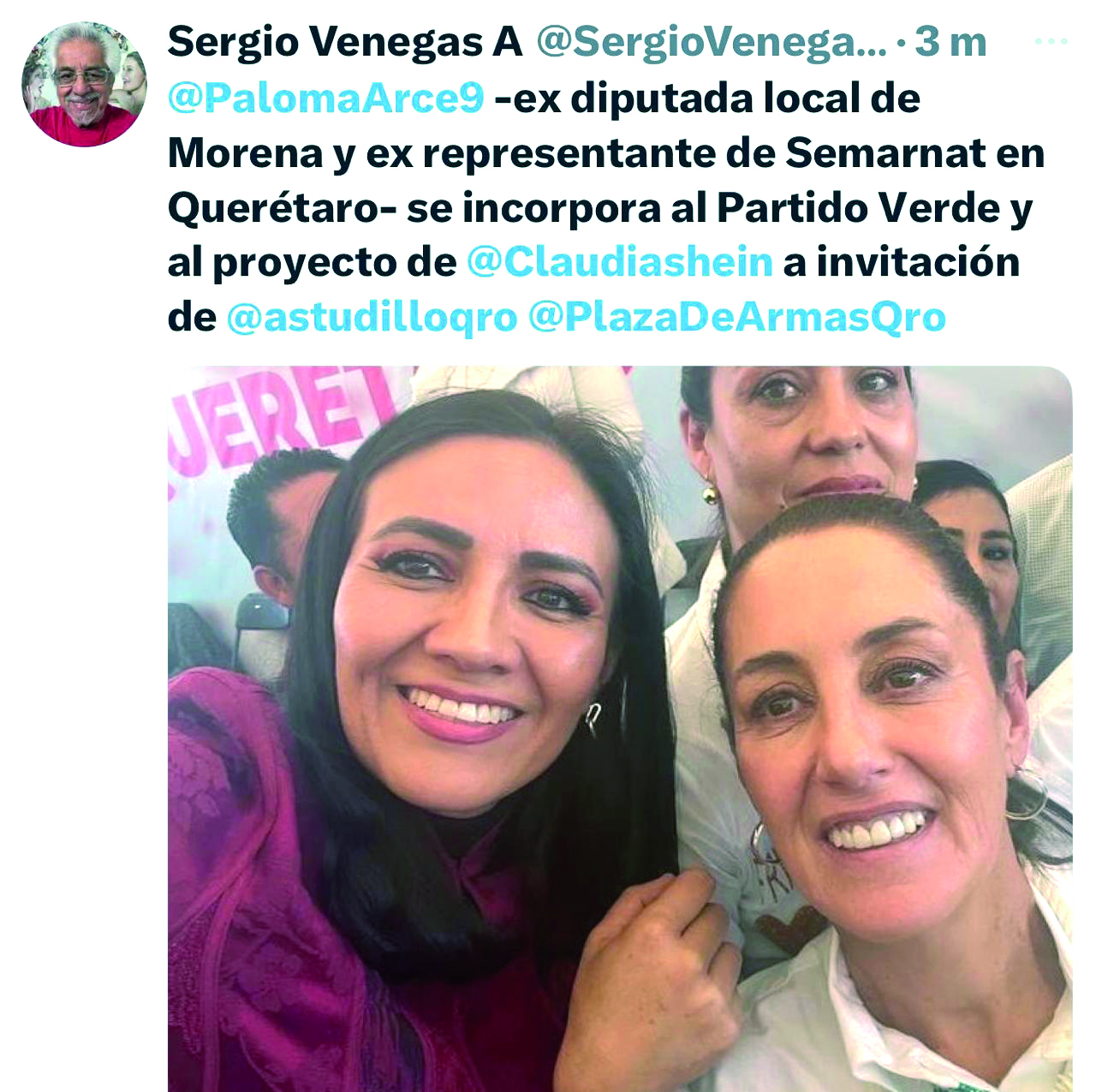 3 Sumó el líder del Partido Verde, Ricardo Astudillo a la exdiputada local Paloma Arce Islas, una de las mejores cartas de la 4T en Querétaro. La también exrepresentante de Semarnat en el Estado atenderá los temas ambientales que definen a esa organización. Punto a favor. Licenciada en derecho por la Universidad Autónoma de Hidalgo y maestra en administración pública por la Universidad del Valle de México ganó en 2018 el primer distrito local en poder del PAN por casi 20 años y coordinó la bancada de Morena en la LIX Legislatura, desde donde aspiró a la candidatura a la alcaldía capitalina otorgada al expriista Chema Tapia. Fue postulada por Querétaro Seguro desde donde apoyó el proyecto de la presidenta Claudia Sheinbaum.