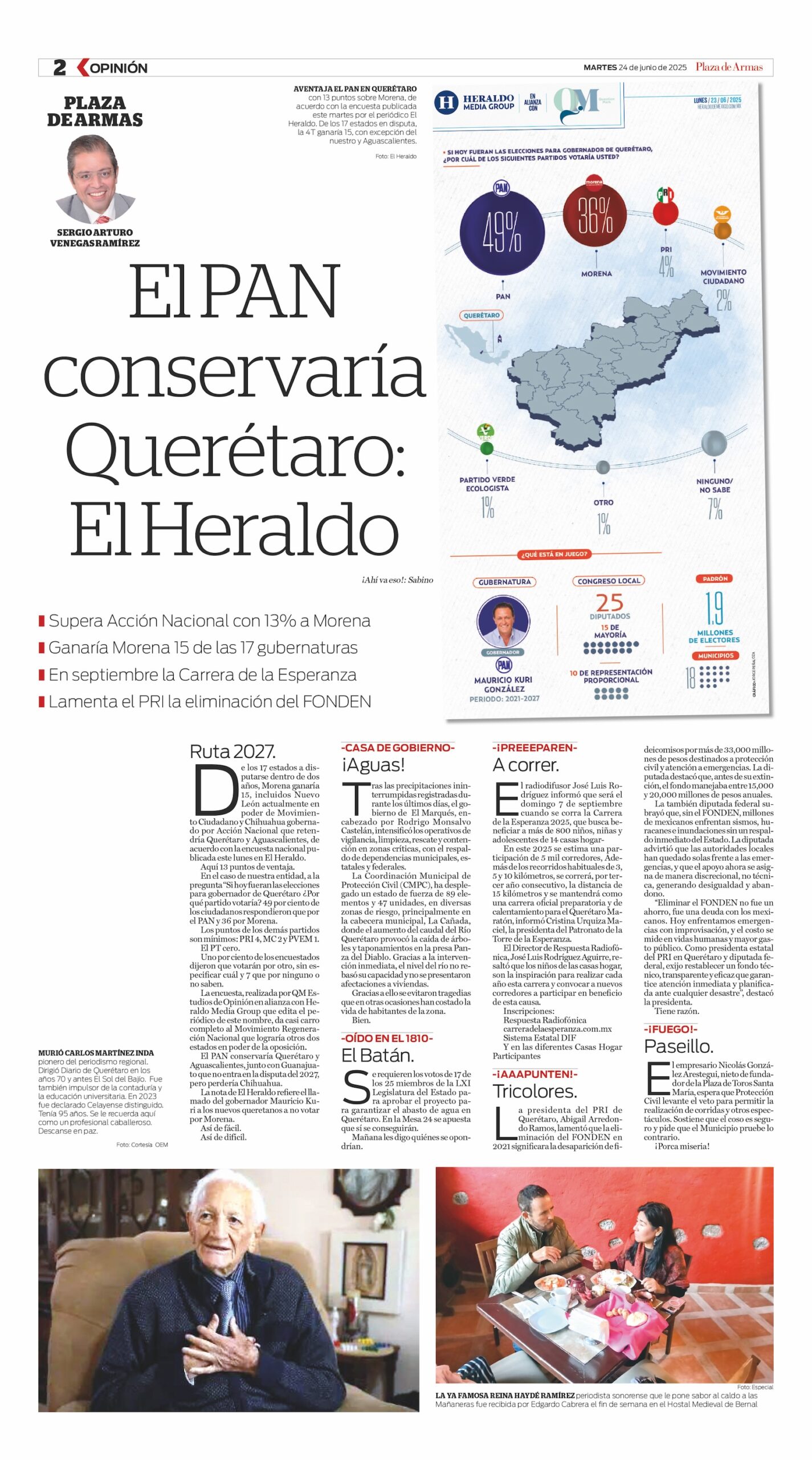 5 Para Sinuhé Arturo Piedragil Ortiz, fundador y primer presidente estatal de Morena en Querétaro, su partido tiene cartas competitivas para el 2027, como el diputado federal Luis Humberto Fernández y la senadora Beatriz Robles, pero “la definición se va a dar a través de un proceso de encuesta, que es nuestro mecanismo, nuestro método”. Entrevistado por PLAZA DE ARMAS, luego de la visita de la presidenta Claudia Sheinbaum para dar el banderazo al tren de pasajeros México-Querétaro junto con el gobernador Mauricio Kuri, dijo que exigirán derechos de autor al PAN por las bardas de sus adelantados.