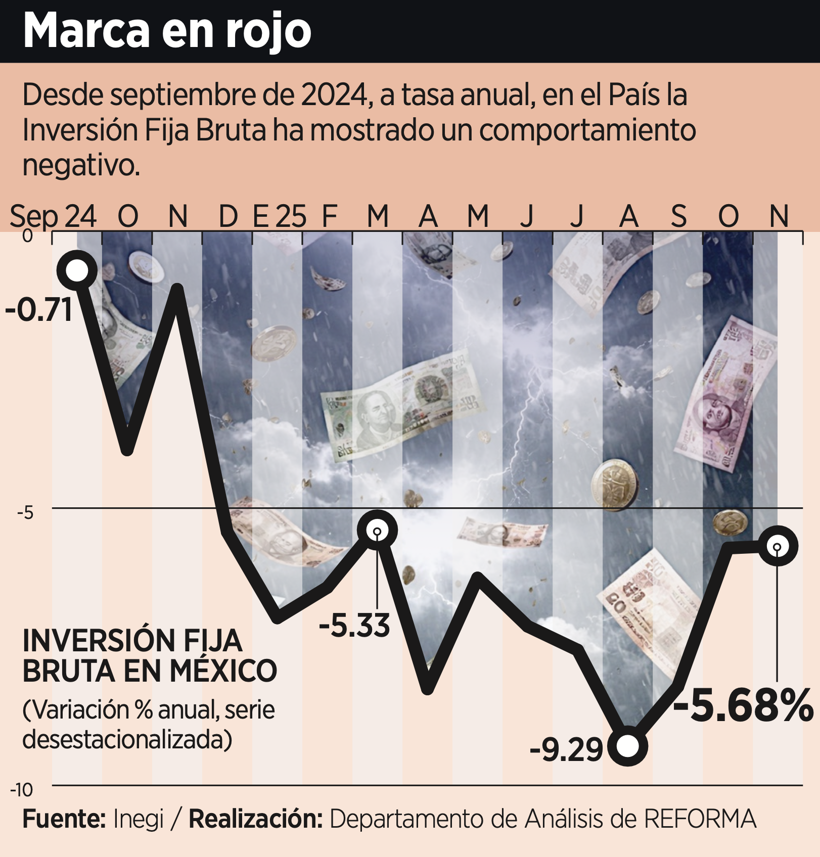 En México, el total de la inversión disminuyó 7 por ciento de enero a noviembre de 2025, respecto al mismo periodo del año previo, frente a 4.33 por ciento en 2024, con lo que interrumpió cuatro años con avances, de acuerdo con datos ajustados por estacionalidad del Instituto Nacional de Estadística y Geografía (Inegi).