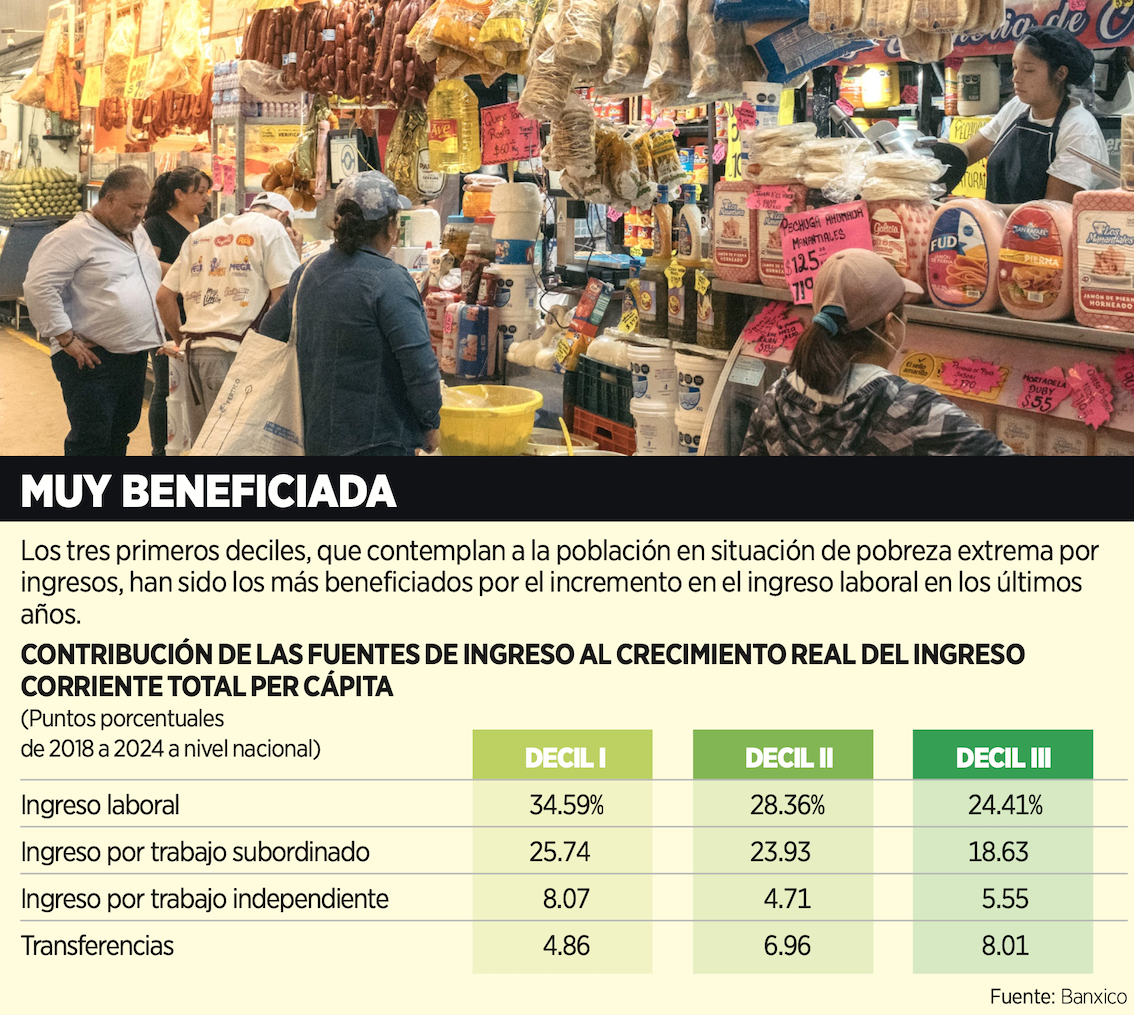 En un análisis sobre cómo un mayor ingreso de los hogares contribuye a la disminución de la pobreza extrema, publicado el 11 de diciembre de 2025, Banxico explicó que en todas las regiones del País el crecimiento real del ingreso corriente total per cápita entre 2018 y 2024 se atribuyó principalmente al aumento del ingreso laboral y, en menor medida, al de las transferencias.