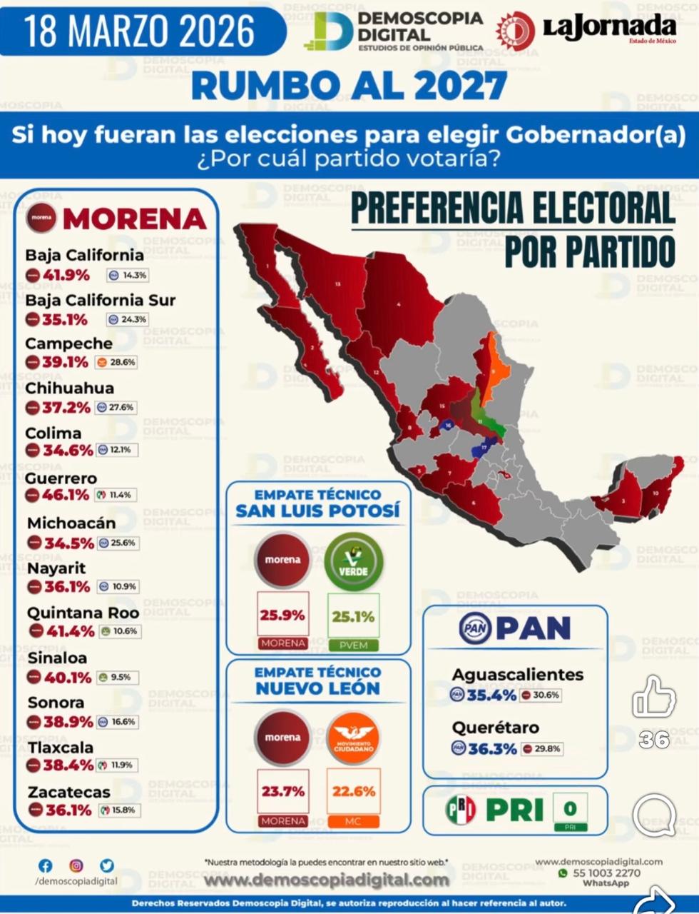 La última gráfica publicada por Demoscopia Digital y La Jornada, a propósito de su encuesta del 18 de marzo, da ventaja a Morena en 13 (ya no 15) de los 17 estados que renovarán gobiernos el año próximo, empates técnicos en San Luis Potosí con el Verde (¿?) y en Nuevo León con Movimiento Ciudadano, y triunfos del PAN en Aguascalientes y ¡Querétaro!, si hoy fueran las elecciones.