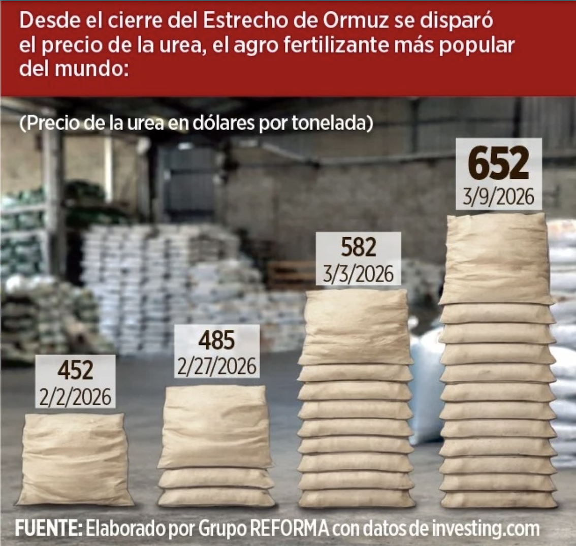 México, Estados Unidos y Canadá enfrentarán dificultades en la nueva temporada de siembra debido a la escasez y encarecimiento de fertilizantes importados del Medio Oriente, así como de los insumos para producirlos localmente, por el bloqueo de Irán al Estrecho de Ormuz desde el 2 de marzo, advirtieron expertos.