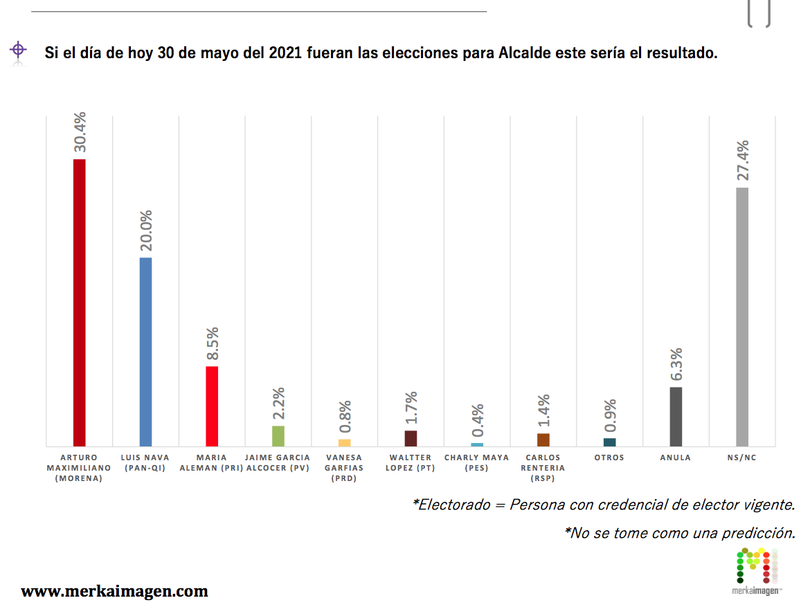 Según el muestreo hecho entre 6 mil 464 capitalinos con credencial de elector, Maximiliano García tendría ya 10.4% de ventaja sobre Nava, al contabilizar 30.4% del morenista, contra 20.0% del panista.