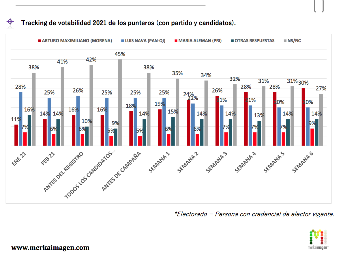 Llama la atención el número de indecisos: 27.4% según MerkaImagen, lo que podría modificar estos números de existir un voto oculto, como consideran algunos analistas.