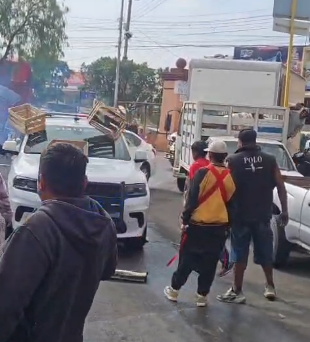 Lo que aparentan ser locatarios y comerciantes del Mercado de Abastos, agredieron con huacales y cajas a dos unidades de la Secretaría de Seguridad Pública municipal de la capital; obligando a los elementos a abandonar el sitio.