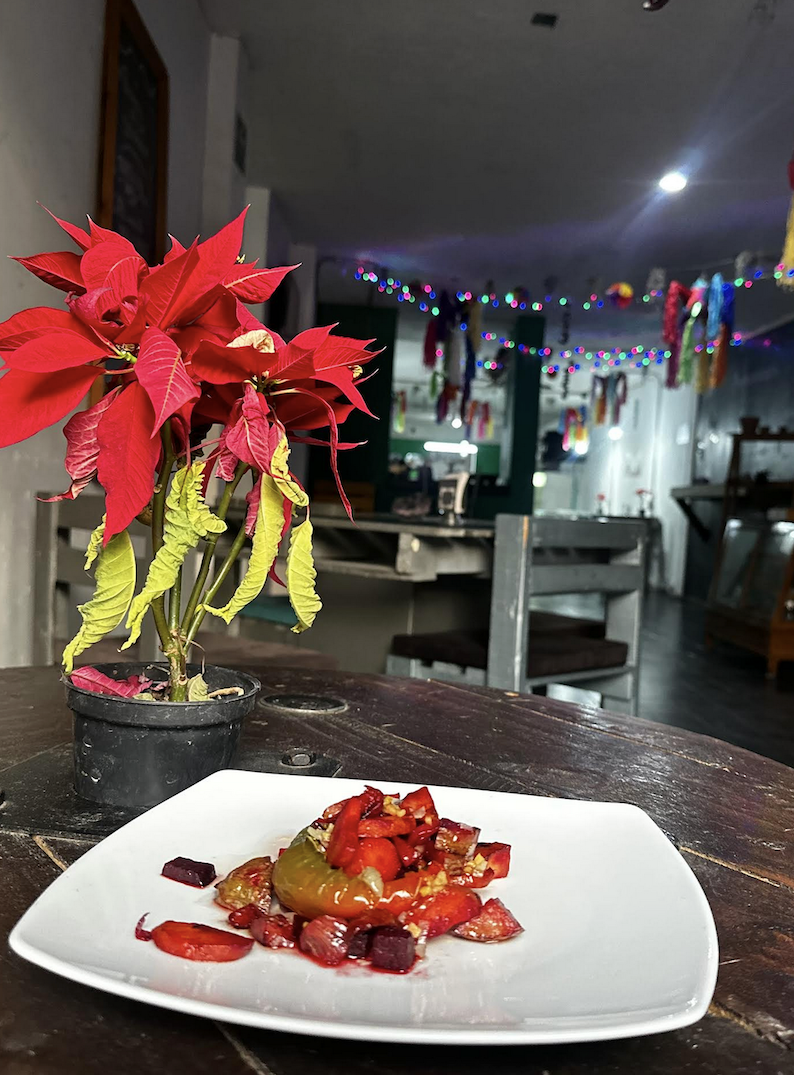Desde hace ocho años, Clorofila también se ha convertido en un punto de referencia para quienes buscan una cena navideña distinta. No se trata de una moda reciente ni de un experimento de temporada, sino de un ejercicio sostenido de reinterpretación de los sabores tradicionales. “Los romeritos, el que es como bacalao, pero en vez de pescado (…) lleva champiñones y setas”, explica Soraya, mientras enumera otros platillos que forman parte del menú decembrino, como la crema de zanahoria con camote; el fusilli al pomodoro; y la berenjena navideña, que lleva manzana, plátano macho, pera y durazno con gravy vegano, acompañado de papas cambray.