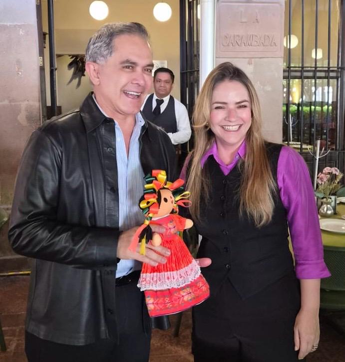 La regidora Paulina Aguado, de MC, se encontró la mañana de este lunes en el restaurante Chucho el Roto con el exjefe de gobierno del DF Miguel Ángel Mancera y le regaló una Lele vestida de color naranja.