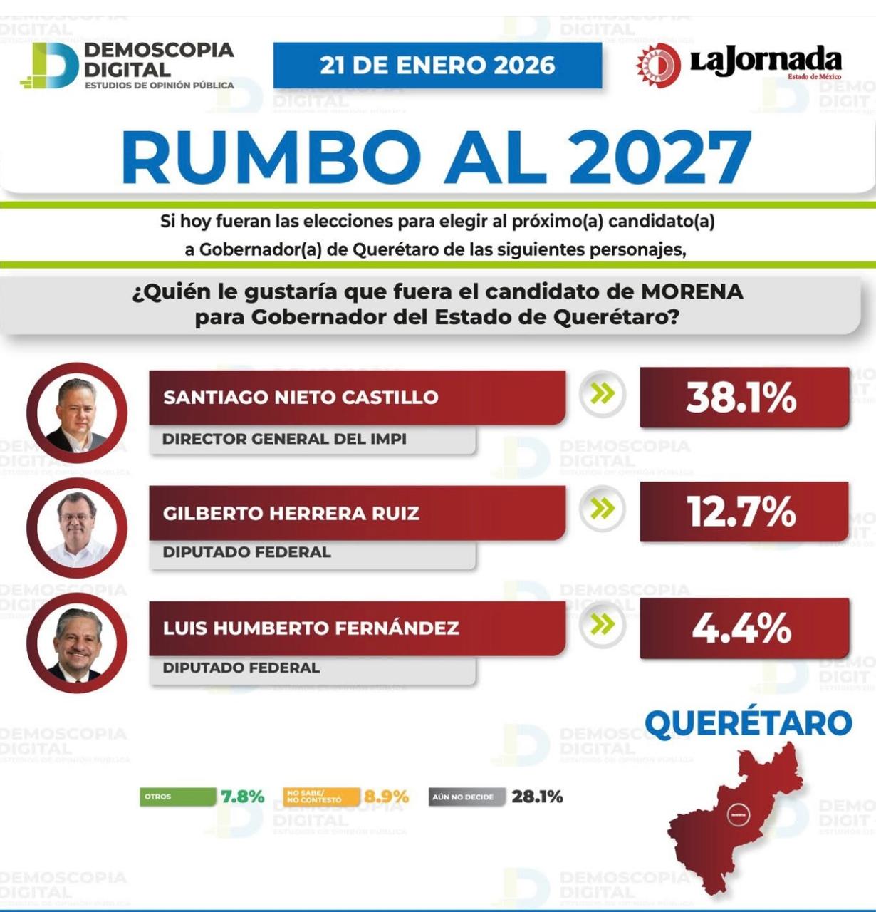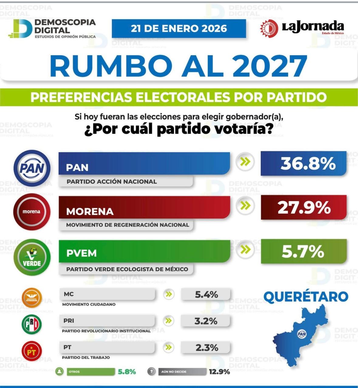 Acción Nacional se mantiene en primer lugar en las preferencias electorales de los queretanos para la gubernatura, de acuerdo con la encuesta de Demoscopia Digital/La Jornada divulgada este miércoles 21 de enero con 36.8 por ciento contra 27.9 de Morena, números similares a los de la anterior, publicada en diciembre.