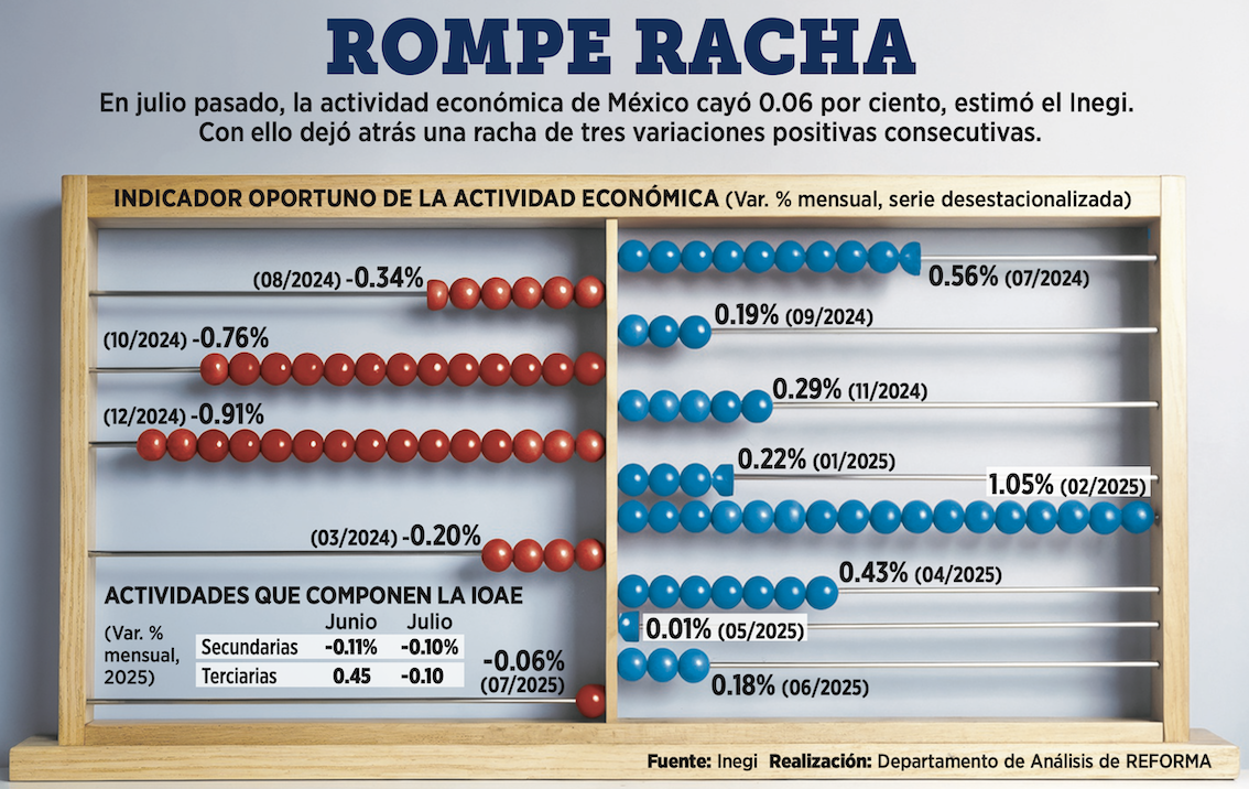 En julio, el Indicador Oportuno de la Actividad Económica (IOAE) del País retrocedió 0.06 por ciento mensual, con lo que puso fin a tres meses consecutivos de aumentos, de acuerdo con cifras ajustadas por estacionalidad del Instituto Nacional de Estadística y Geografía (Inegi).