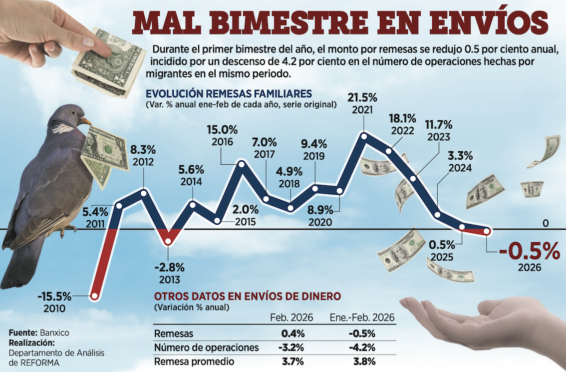 Tras una docena de incrementos, en los primeros dos meses de 2026 los flujos de remesas familiares descendieron 0.5 por ciento a tasa anual, luego de un aumento de la misma magnitud en el año anterior.