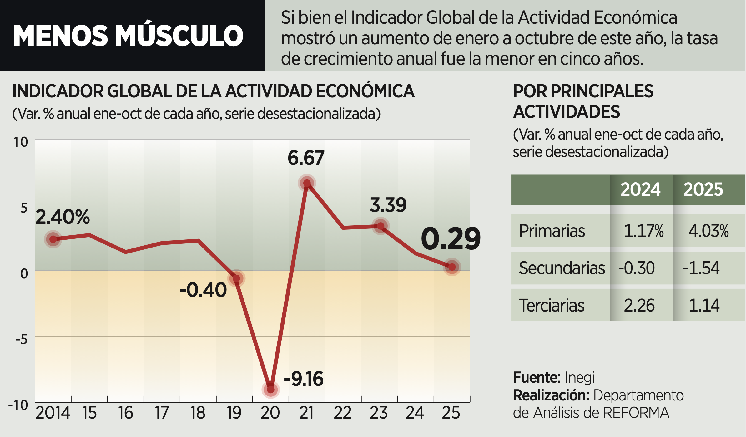 De enero a octubre de este año, la economía apenas creció 0.29 por ciento anual, debido a la debilidad del sector industrial y a la desaceleración en los servicios.