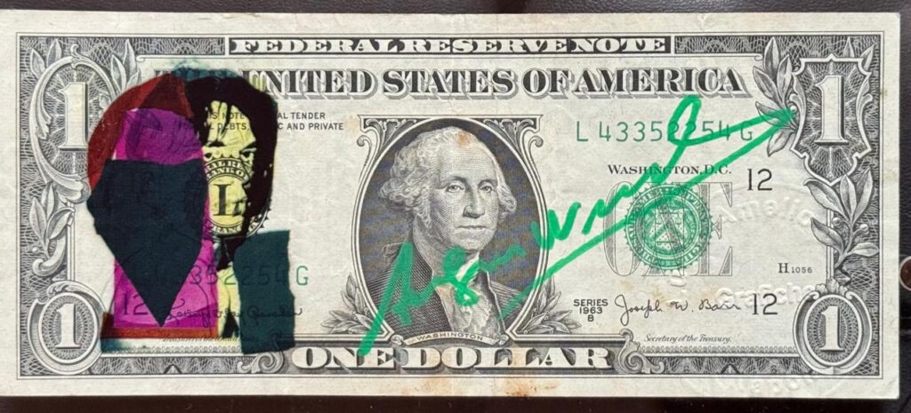 Basquiat, por su parte, tomó el billete como un territorio de conflicto. Sus trazos impulsivos y su escritura nerviosa sobre la superficie del dinero transformaban el objeto en un botón de salida. “Yo mismo soy valor”.