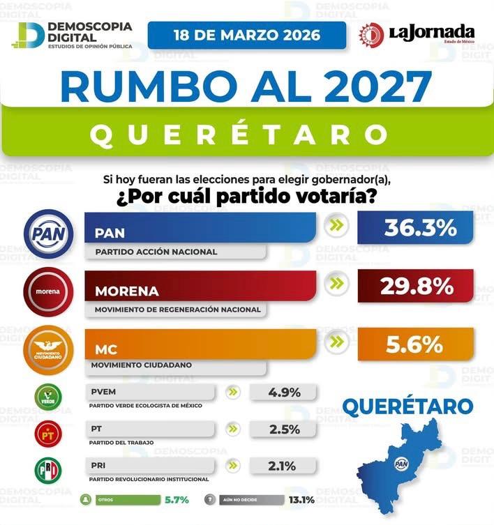 En su encuesta publicada este 18 de marzo Demoscopia Digital/La Jornada el PAN mantiene las preferencias con 36.3 por ciento, Morena el segundo lugar con 29.8 y MC el tercero con 5.6%.