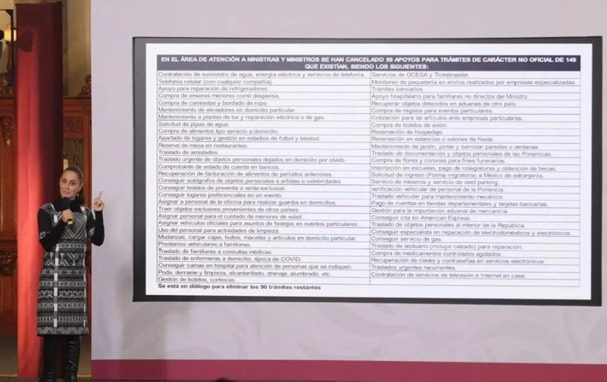 Resaltó que en el área de atención a ministros se han cancelado 59 apoyos para trámites de carácter no oficial de 149 que existían, entre los que se destacan: compra de enseres menores como despensa, apartado de lugares y gestión en estadios de futbol y beisbol; traslado de amistades; traslado urgente de objetos personales dejados en domicilio por olvido; conseguir autógrafos de objetos personales a artistas o celebridades; conseguir boletos de preventa o venta exclusiva; servicios de Ocesa y Ticketmaster; trámites bancarios; inscripción de escuela, pago de colegiaturas y becas; compra de medicamentos.