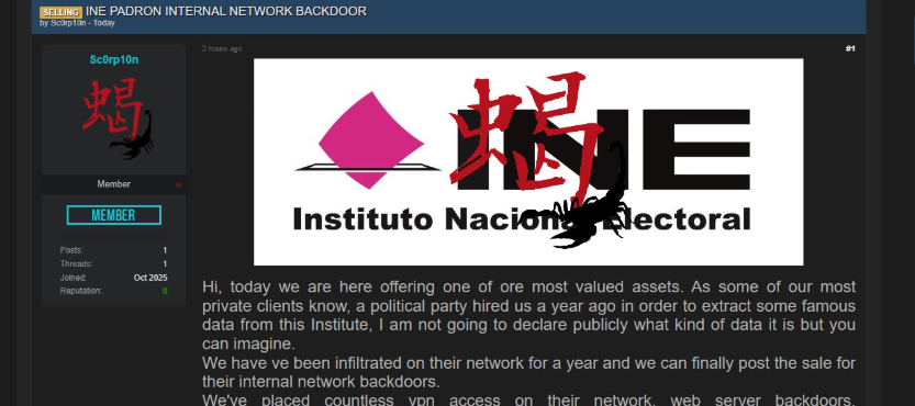 Servidores internos del Instituto Nacional Electoral (INE) habrían sido comprometidos por el grupo hacker “Sc0rp10n”, involucrado en la venta de datos robados de varias instituciones gubernamentales mexicanas.
