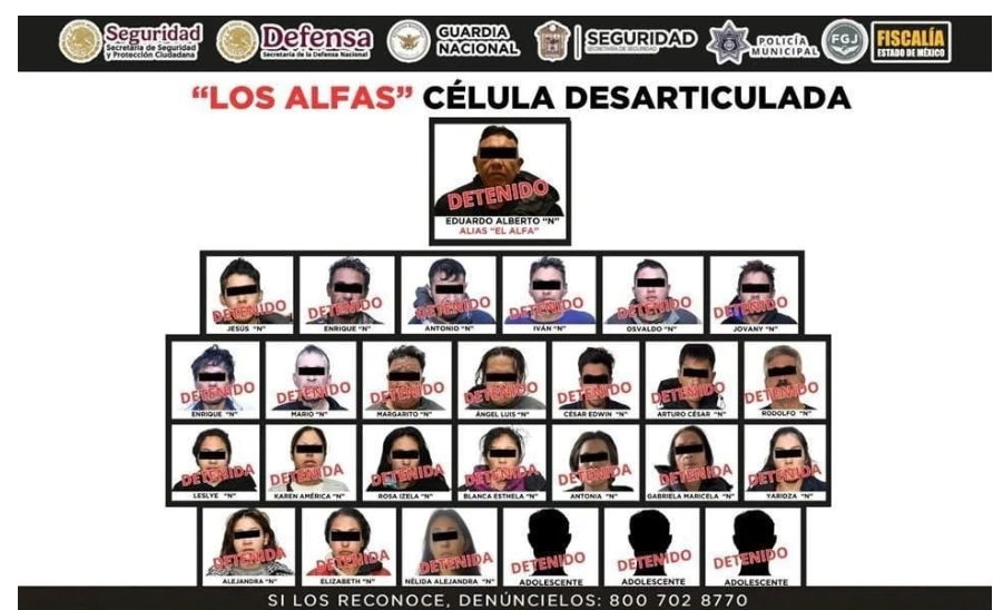 La Secretaría de Seguridad y Protección Ciudadana (SSPC) dio a conocer la detención de 27 personas, entre ellas el líder del grupo delictivo Eduardo Alberto “N”, alias “El Alfa”.