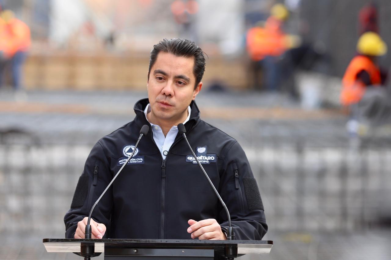 El presidente municipal de Querétaro, Felipe Fernando Macías Olvera, ofreció una rueda de prensa desde las obras que se realizan en el Dren Peñuelas, mismas que llevan al momento un 35 por ciento de avance.