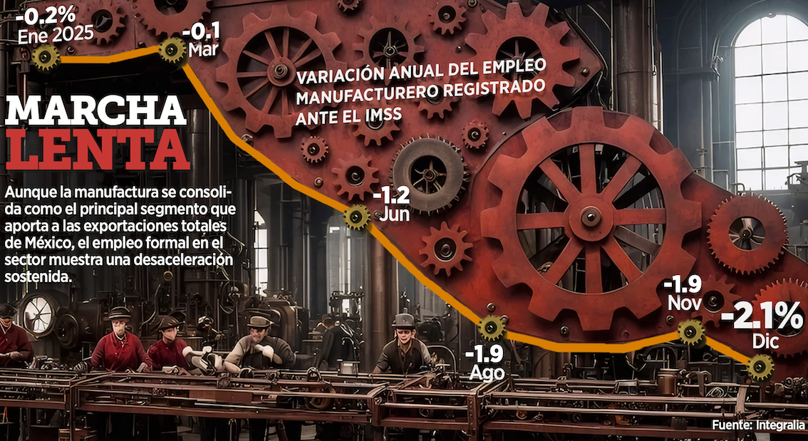 De acuerdo con Integralia, en diciembre de 2025 se registraron 5 millones 582 mil 426 puestos de trabajo en la industria manufacturera afiliados al IMSS, lo que implicó la pérdida de 106 mil 686 empleos respecto al mes previo, el nivel más bajo desde febrero de 2022.