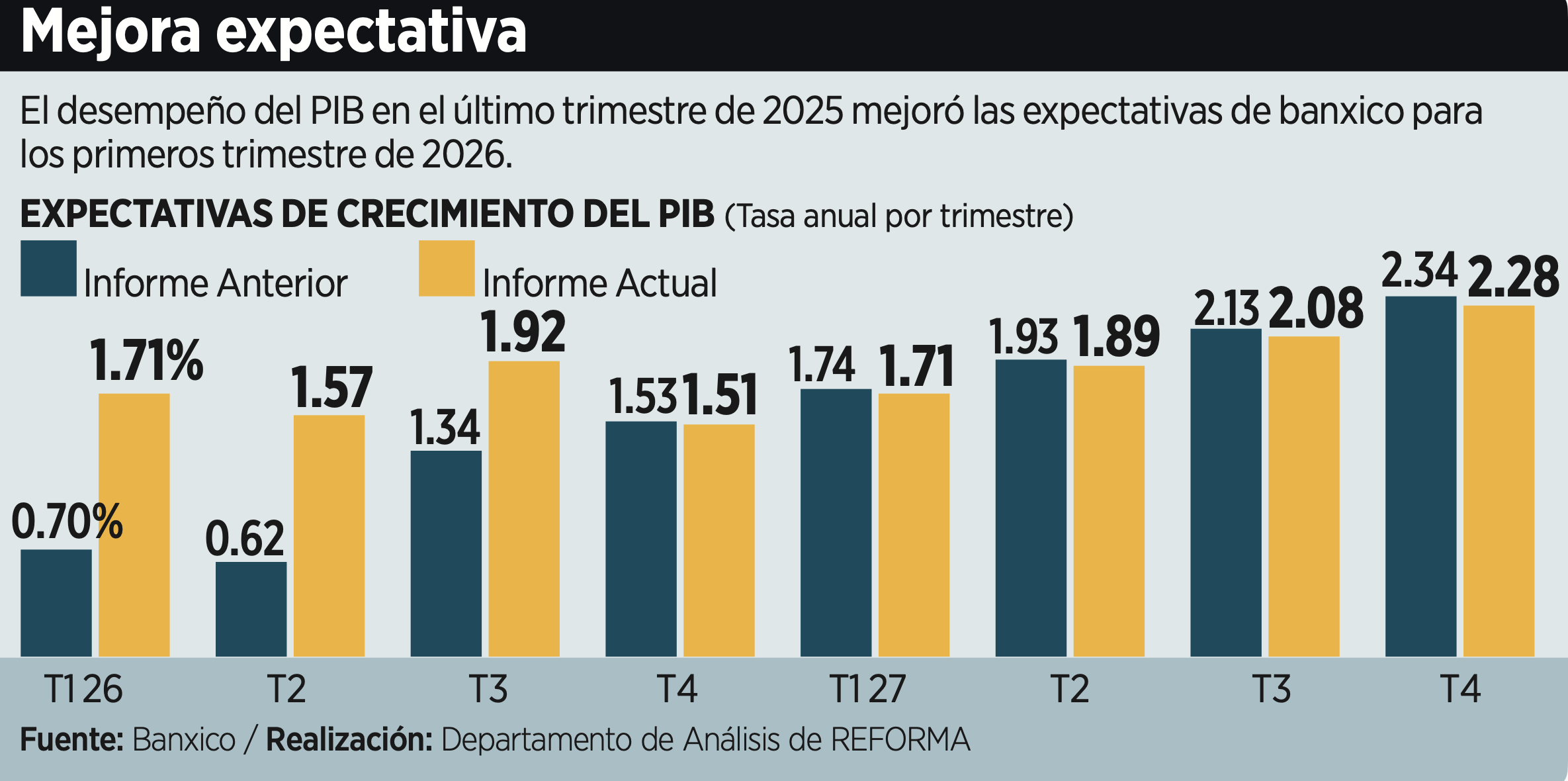 Banxico, por su parte, elevó su pronóstico de crecimiento para 2026 de 1.1 a 1.6 por ciento, mientras que para 2027 lo mantuvo en 2.0 por ciento.