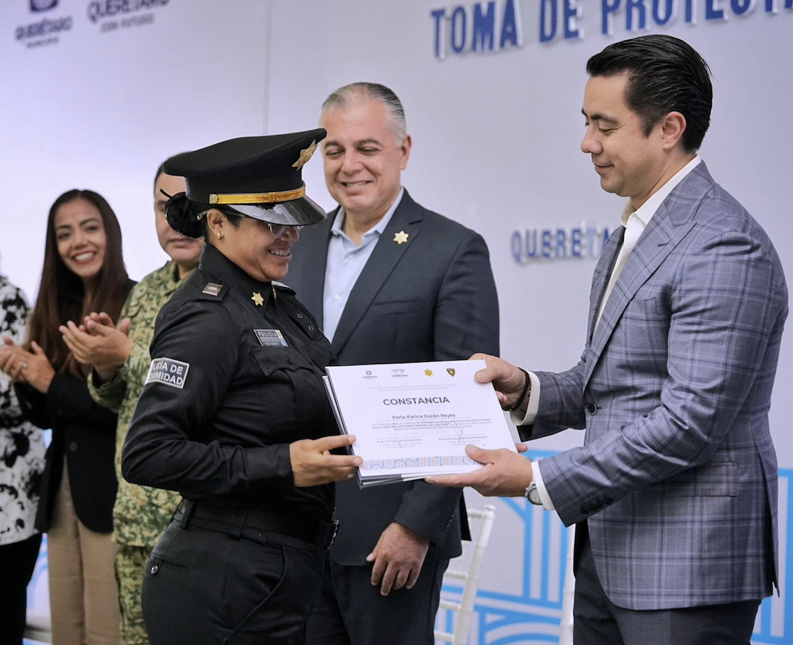 “Por eso es que también es de mucha emoción el hecho de que sean sus propios familiares quienes estén entregando la insignia, el grado, ahí al ladito del corazón, porque ahí al ladito del corazón está Querétaro, está la insignia y, en el corazón mismo, está su familia. Los elementos a los que yo les pido que trabajen por ellos, por quienes les inspiran día con día a hacerlo mejor, por su corporación, por su ciudad, pero sobre todo por sus familias”, manifestó.