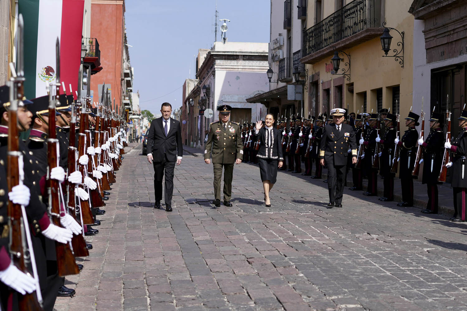 Escoltada por el gobernador Mauricio Kuri y el Secretario de la Defensa Nacional Ricardo Trevilla Trejo, así llegaba la Presidenta Claudia Sheinbaum a la ceremonia en el Teatro de la República .