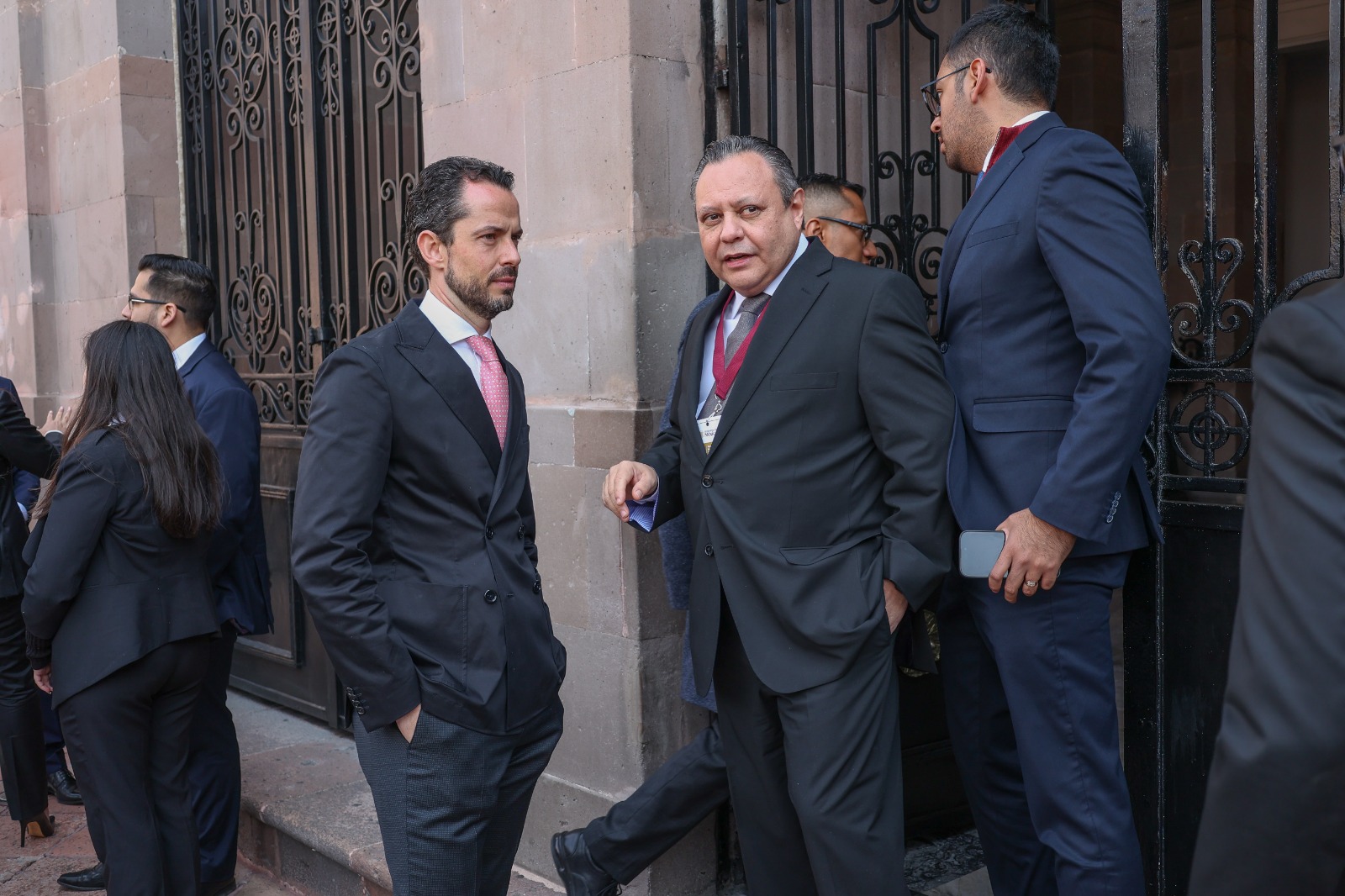 Kenia López Rabadán, Presidenta de la Cámara de Diputados, el Ministro Hugo Aguilar Ortiz de la SCJ y la Senadora Laura Itzel Castillo Juárez a la espera para recibir a la Presidenta a su llegada al Teatro.