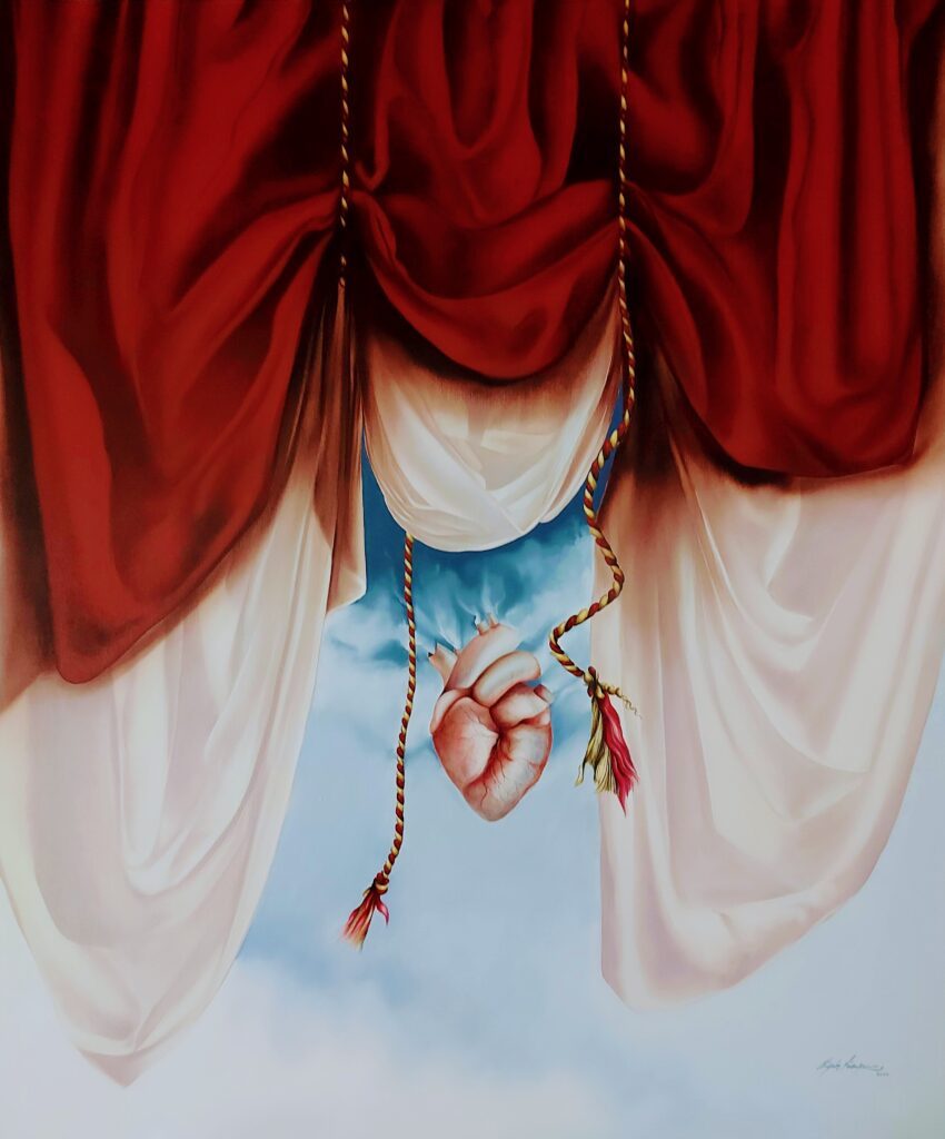 Hoy, su trabajo gira en torno a sus emociones y vivencias, transitando entre lo abstracto, la figura humana, los corazones, los telones y los sueños. El corazón –presente en muchas de sus piezas– no es sólo un órgano: es símbolo arquetípico de las emociones, portal entre el mundo físico y el metafísico. “Tengo con él un diálogo constante”, comparte. “Trabajo desde su forma, su construcción… y también su deconstrucción”. Amor, duelo, pérdida, renacimiento: todo puede latir en sus telas.