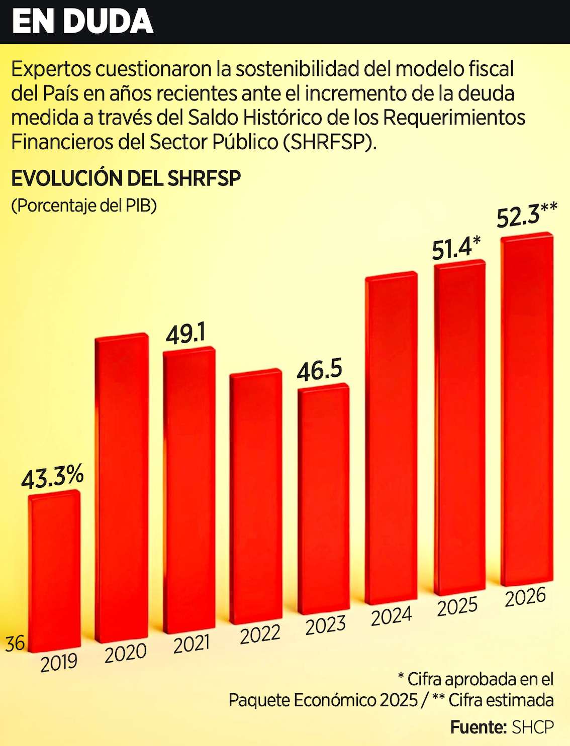 “Lo que se promete en el Paquete Económico 2026 es básicamente ofrecer la posibilidad de que se mantenga en un cierto nivel este saldo histórico de 52.3 por ciento del PIB, este nivel difícilmente se logrará sostener”, comentó.