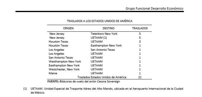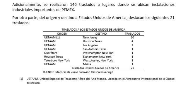 Mientras que a Estados Unidos viajó en un año, un total de 21 veces: diez de estos a New Jersey, cuatro a Houston, dos a Los Ángeles y una a San Antonio. También aparecen viajes a playas exclusivas de Nueva York como East Hampton y Westhampton, utilizando la aeronave de Pemex: