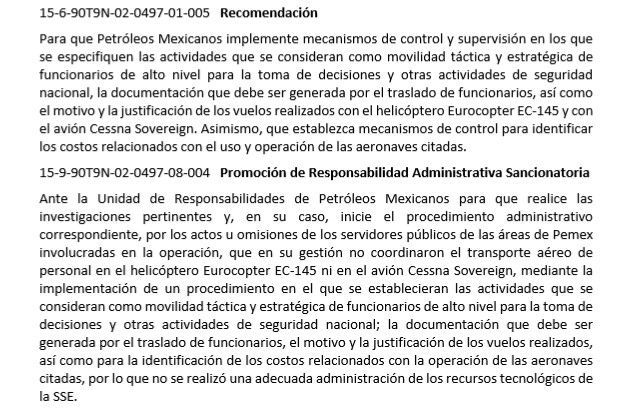 La Auditoría Superior de la Federación, determinó solicitar a la contraloría de Pemex comenzar un procedimiento de responsabilidad contra los funcionarios por la falta de control que tiene la empresa paraestatal del uso de las dos aeronaves asignadas a Emilio Lozoya Austin, pues no se realizó una adecuada administración de los recursos de la Subdirección de Salvaguardia Estratégica, adscrita a la Dirección Corporativa de Administración y Servicios de Pemex y que tiene a cargo las aeronaves.