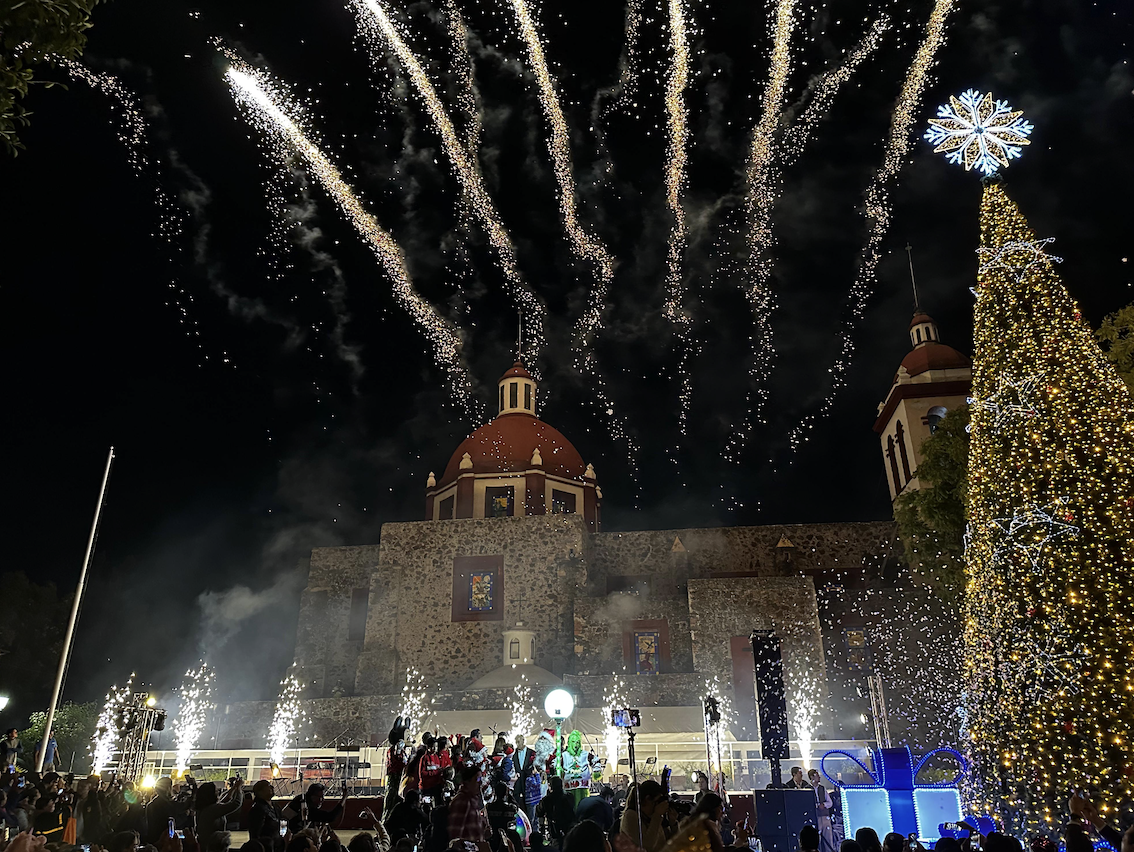 El cielo nocturno ya estaba en su esplendor a las 6:30 de la tarde, cuando el Jardín Principal de El Pueblito se transformó en un escenario de luces, música y color para dar paso al tradicional encendido del árbol navideño de Corregidora. Entre niñas, niños y familias completas, comenzaron a aparecer personajes como Santa Claus, Mickey Mouse y el Grinch, quienes provocaron sonrisas y fotos espontáneas previo al conteo regresivo. Más tarde, un estallido de fuegos artificiales iluminó el firmamento y selló el momento en una atmósfera puramente decembrina.