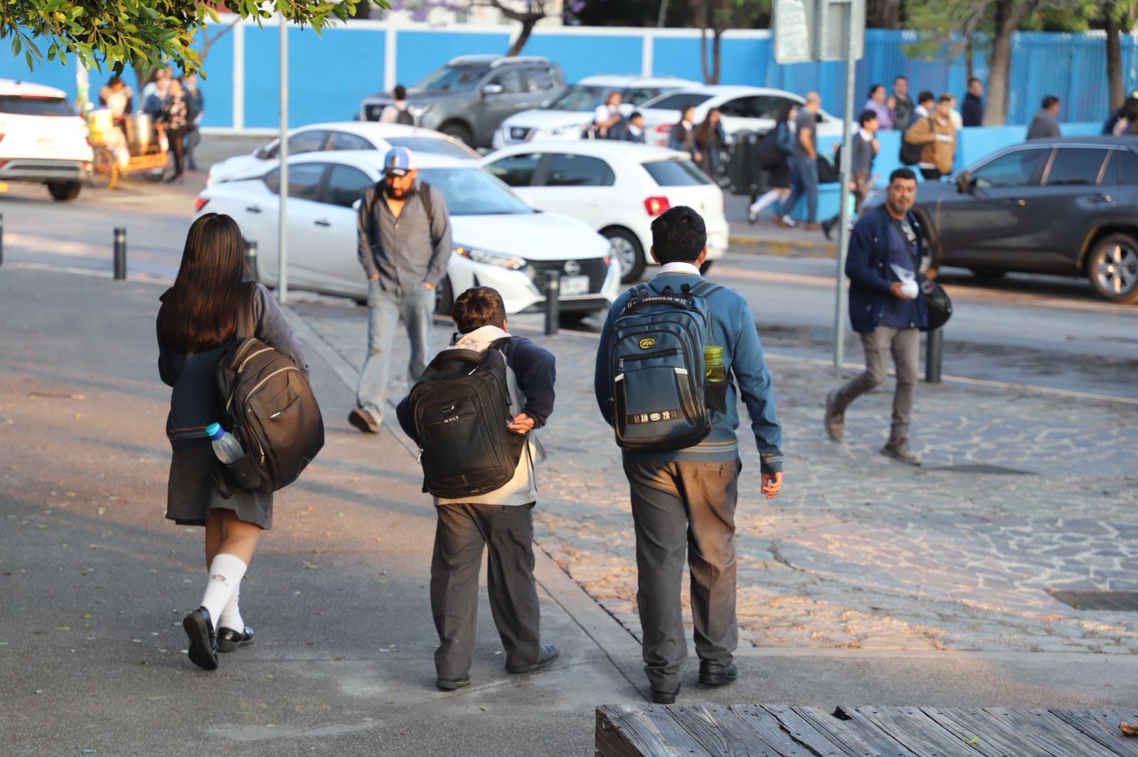 Sobre la calle Manuel Acuña, a un costado del Museo de Arte Contemporáneo de Querétaro (MACQ), un padre camina, con sus dos hijas, por la banqueta de cantera rosa; ésta aguarda a ser secada por el sol y viste un tapiz natural de flores de jacaranda. Las ruedas de la mochila de un niño aplastan algunos de los pétalos morados, mientras el aroma se intensifica con la humedad. El tráfico avanza lento en la zona, cada conductor está atento a las indicaciones del personal de movilidad que resguarda el tránsito peatonal hacia la Escuela Primaria ‘Naciones Unidas’. Algunos niños cargan mochilas más grandes que ellos; otros, un peluche de tigre que se asoma entre sus bracitos.