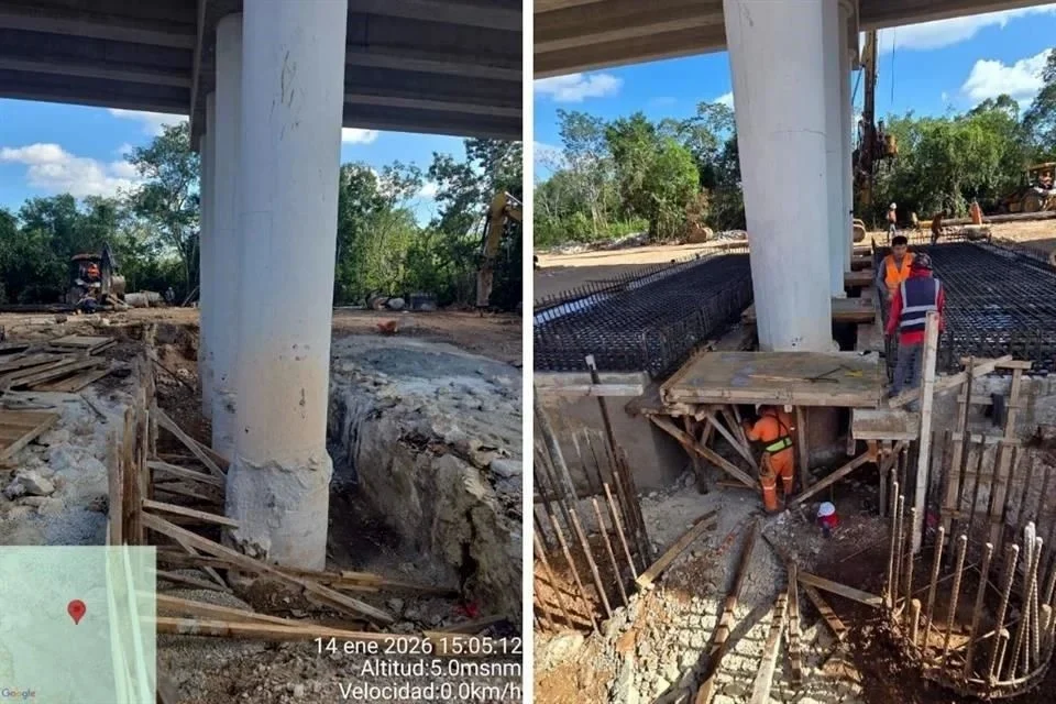 “Están reparando las columnas, y vamos a ponerlo entre comillas, o lo que soporta el peso del tren, porque seguramente se está hundiendo. Esto puede ser porque están fallando las columnas mismas que ya hemos reportado, que muchas de ellas estaban en muy malas condiciones, que no fueron bien construidas, o porque el lugar donde se asentaron las dichosas columnas, pues, está cediendo”, dijo el ambientalista José Urbina, fundador del proyecto Cenotes Urbanos e integrante de Sélvame del Tren.