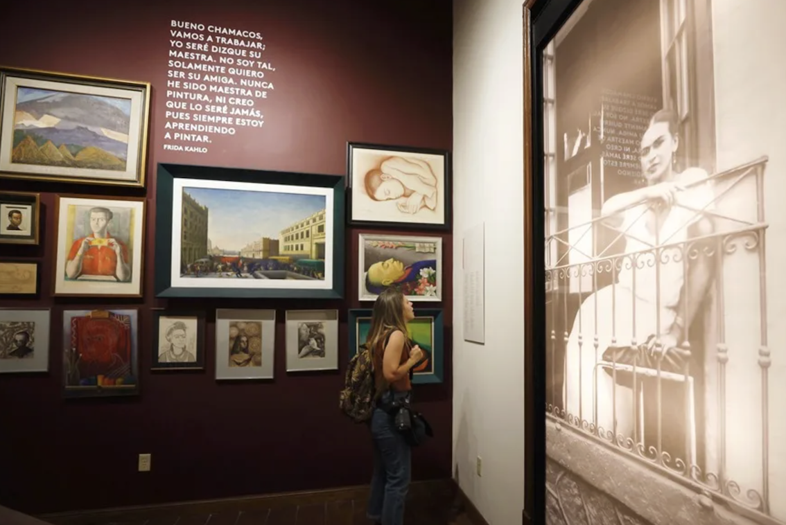 Entre las imágenes de su padre, el primer fotógrafo que trabajó para el expresidente Porfirio Díaz (1876-1911) y para el que documentó la construcción de algunas de las obras arquitectónicas más importantes del país, se entremezclan los trabajos de la juventud de Frida, como su primer mural ubicado en la cocina de la casa o la famosa Charola de amapolas.