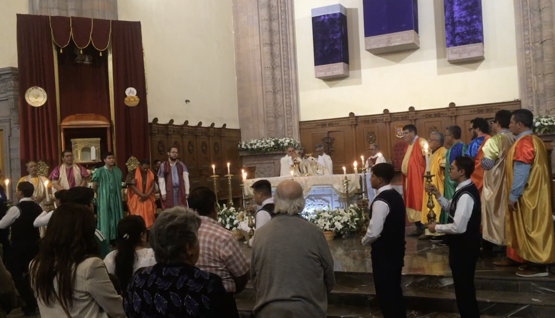 A seis minutos de que comenzara la misa vespertina del Jueves Santo, las velas empezaron a encenderse una a una a lo largo del pasillo central de la Catedral de Querétaro. A seis minutos, seis velas por cada muro, alineadas con precisión hasta el altar, como si marcaran el trayecto por donde minutos después avanzaría el obispo entre la expectativa contenida de los fieles. Afuera, mujeres ofrecían cirios y ramos de flores de manzanilla; adentro, el ambiente comenzaba a transformarse.