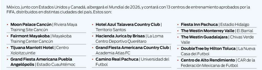 La FIFA dio a conocer la lista oficial de centros de entrenamiento para las selecciones nacionales que participarán en la Copa del Mundo de 2026, torneo que será organizado de manera conjunta por México, Estados Unidos y Canadá.